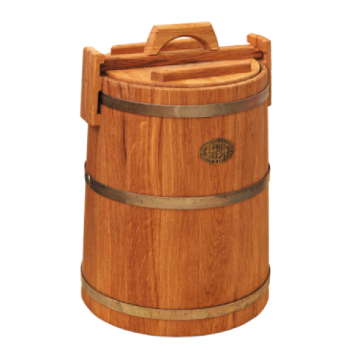 Кадка дубовая 50 л «Бонпос» (обручи из нерж. стали) предназначена для хранения натуральных продуктов: овощей, фруктов и ягод Также в ней рекомендуется заквашивать, делать маринады и хранить мед. По форме кадка представляет собой цилинд с разновеличинными диаметрами вера и дна – 37 см и 42 см соответственно. Ее высота достигает 60 см без крышки. В емкости объемом в 50 л веса 12 кг. За вычетом ее содержимого, то есть – собственная тяжесть, которую не рекомендуется часто передвигать. Прекрасно подходит для маринования рыбы и мяса, хранения продуктов в прохладных погребах.